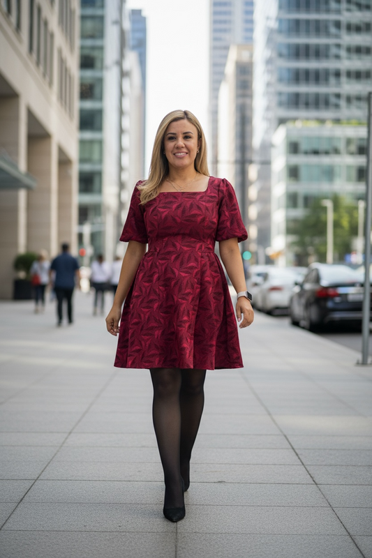Vestido Rojo Ladrillo de Manga Larga Estampado Hojas