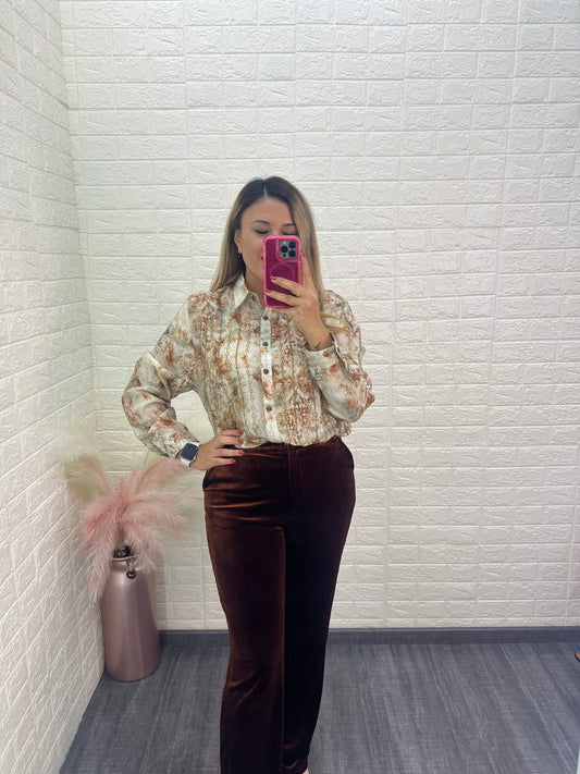 Camisa de Manga Larga Negra Estampado Floral Dorado