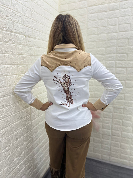 Blusa Vaquera Color Beige con Aplicación de Gamuza