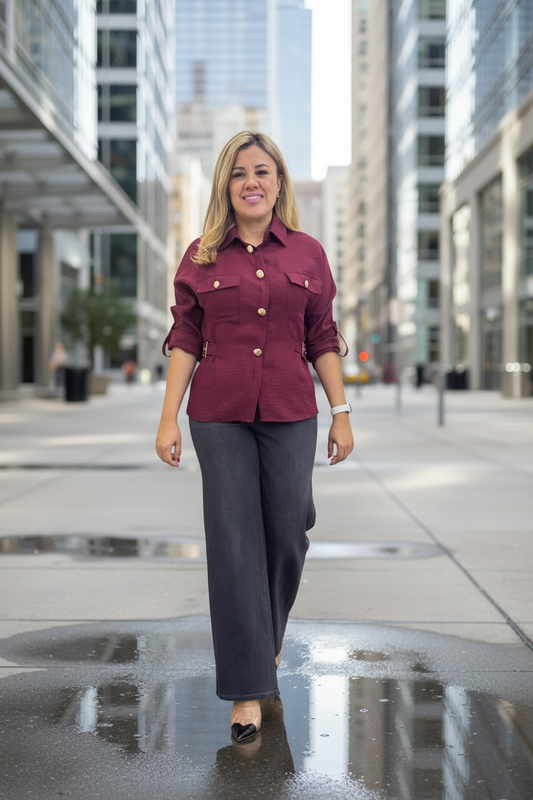 Blusa Satinada Guinda con Botones Dorados Decorativos