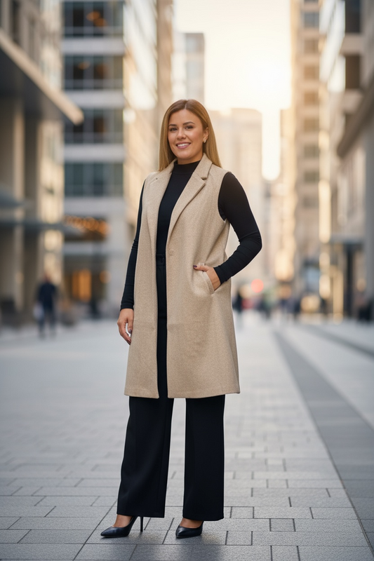 Chaleco Largo de Tela Tipo Lana en Color Hueso