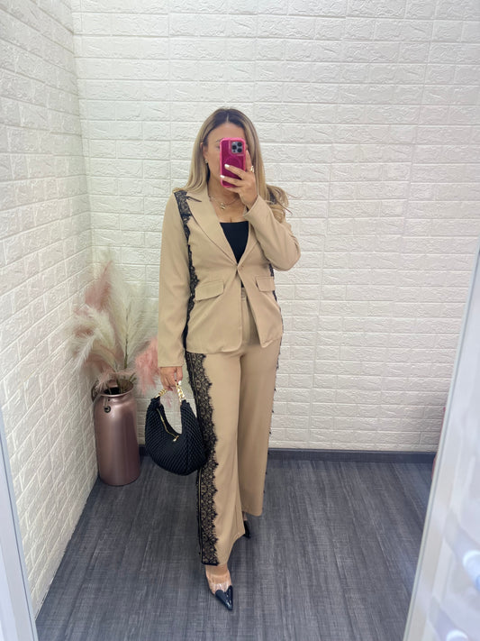 Conjunto de Blazer y Pantalón Beige con Encaje Negro