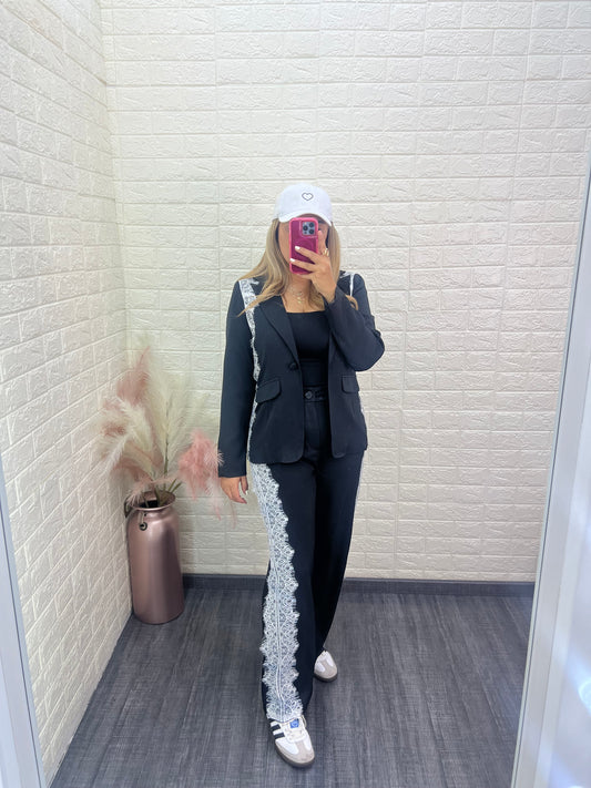 Conjunto de Blazer y Pantalón Negros con Encaje Blanco