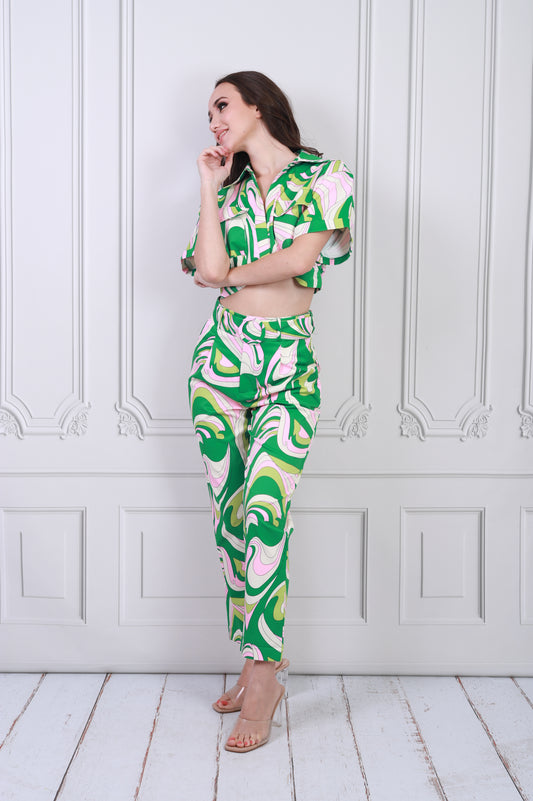 Set de Blusa y Pantalón Estampados Verde con Rosa