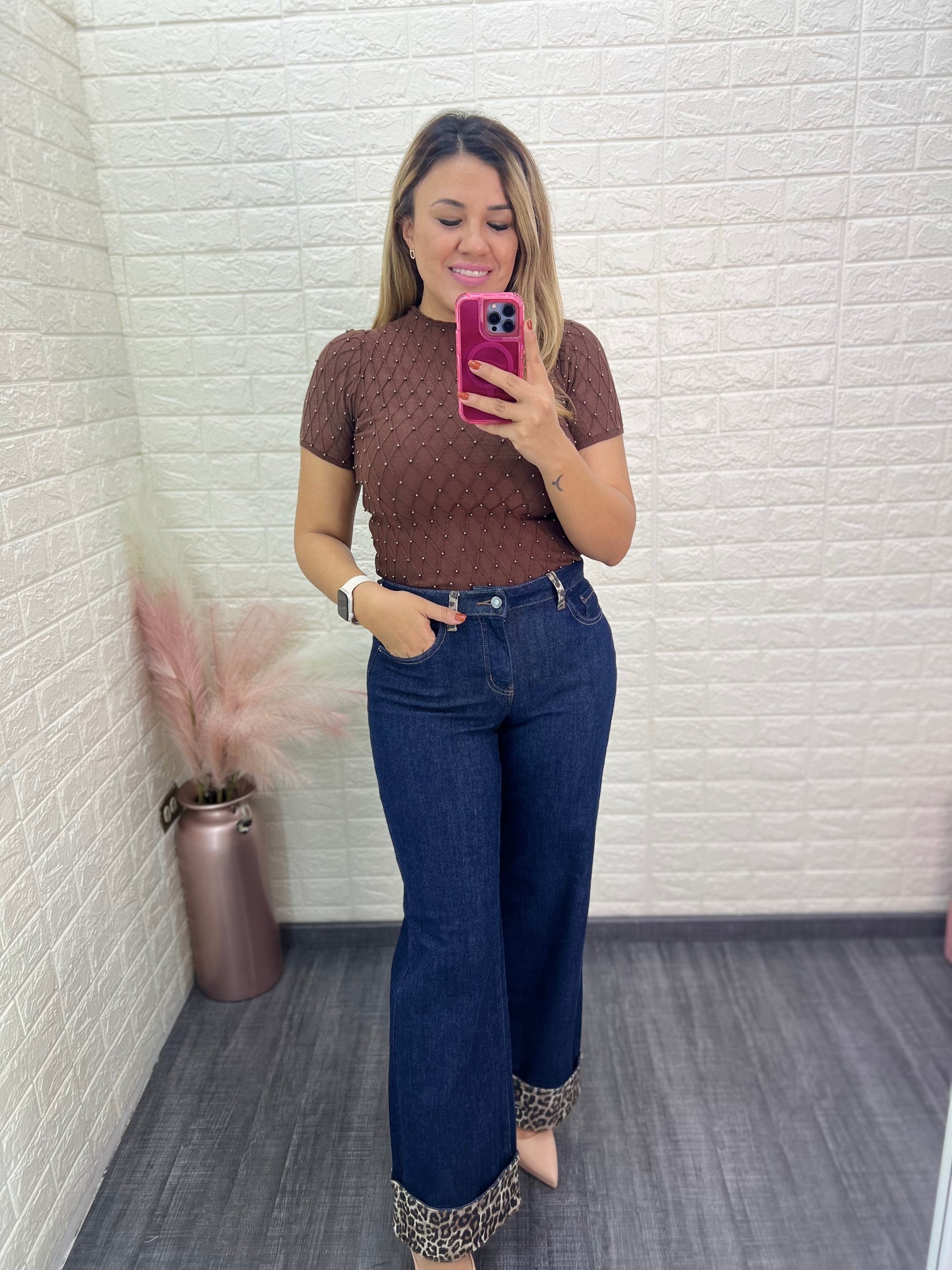 Blusa Café de Manga Corta con Aplicaciones de Perlas