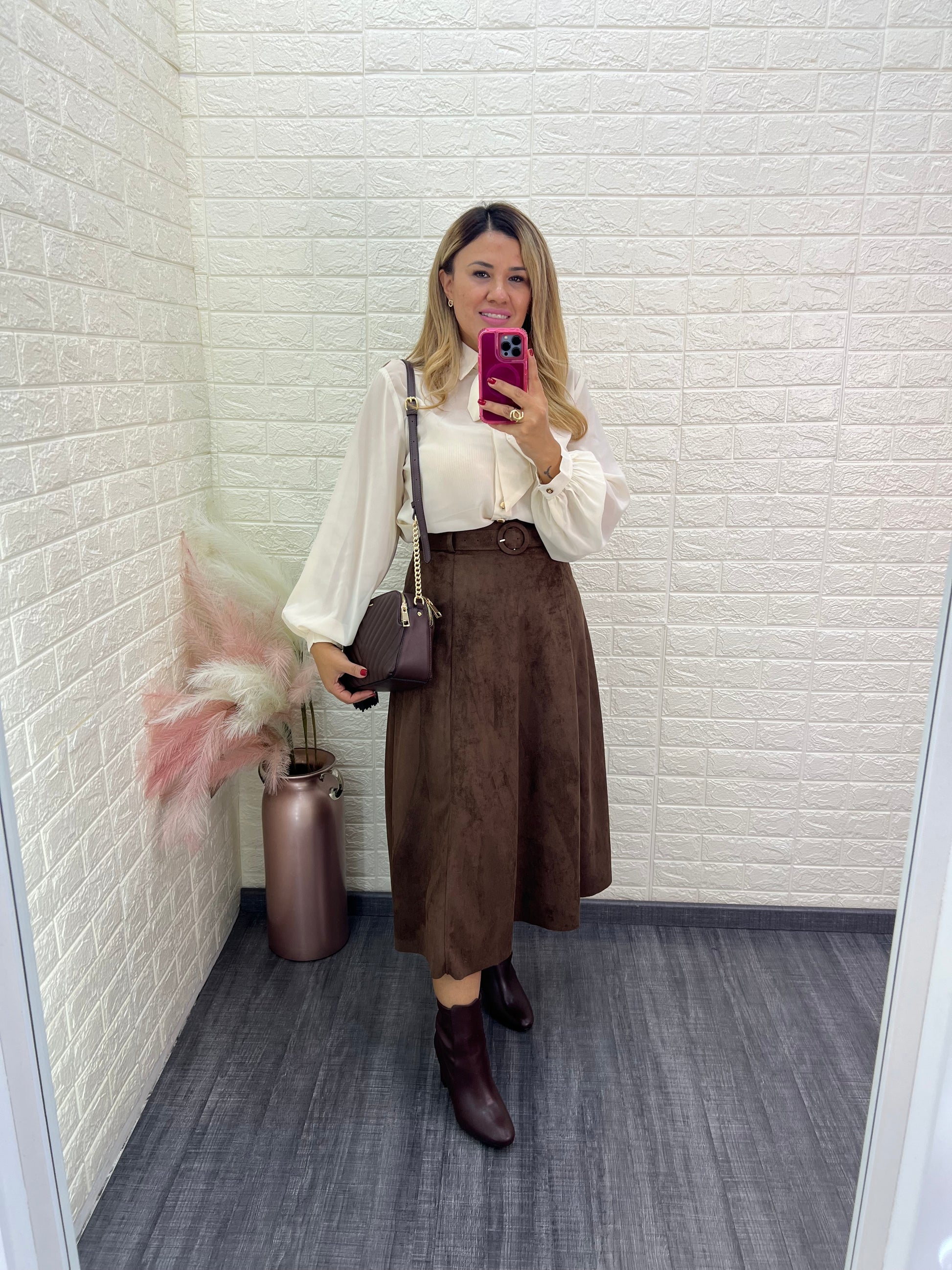Elegancia y feminidad en una sola prenda. Esta blusa de gasa en tono ivory destaca por sus mangas largas y delicados listones cosidos al cuello, pensados para formar un moño decorativo que realza el estilo. Ideal para ocasiones formales o para elevar un look casual con un toque sofisticado.