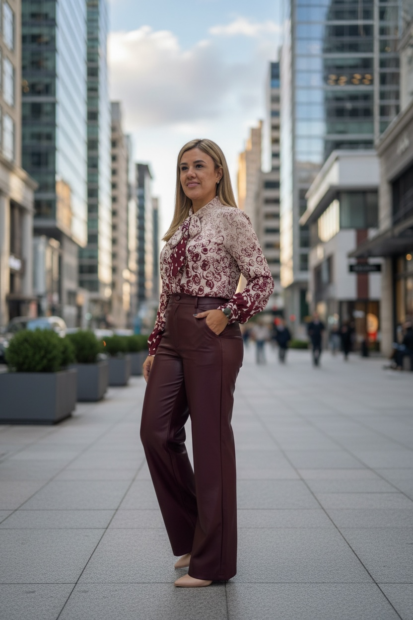Una prenda elegante y femenina que combina el contraste del Guindo con detalles en blanco en un delicado estampado de rosas. Su tela ligera de gasa aporta frescura y movimiento, ideal para crear un look sofisticado y cómodo. Con manga larga, es perfecta para usar en ocasiones casuales o semiformales, dándole un toque romántico y moderno a tu estilo.
