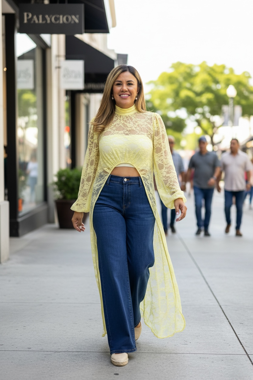 Blusón Largo de Encaje Color Amarillo de Manga Larga