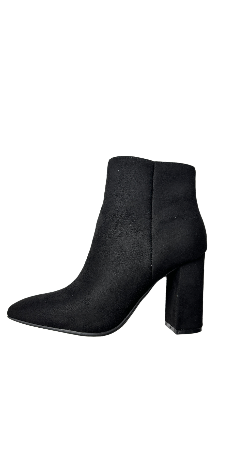 Botín casual en color negro, confeccionado en suave tela de gamuza. Diseño al tobillo con cierre lateral interno tipo zipper que brinda un ajuste cómodo y práctico. Ideal para complementar tus looks diarios con un toque moderno y versátil.