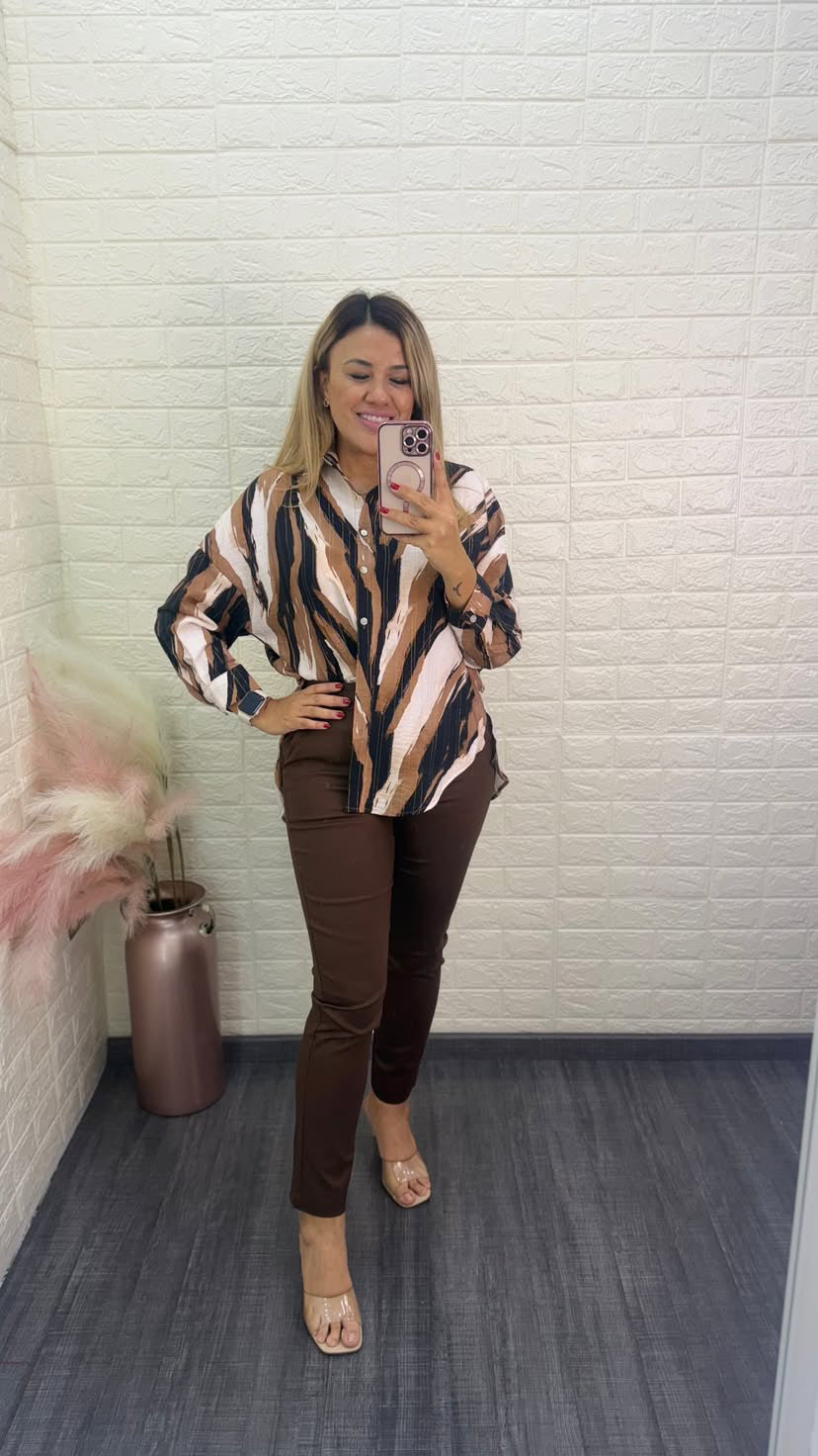 Un diseño elegante y moderno que destaca por su combinación de tonos café y azul, realzada con delicadas rayas doradas en vertical. Esta camisa de manga larga aporta sofisticación y un toque de brillo sutil, ideal para la oficina, reuniones o eventos especiales. Confeccionada en tela ligera y cómoda, se puede combinar fácilmente con pantalones, faldas o jeans para crear un look versátil y chic.