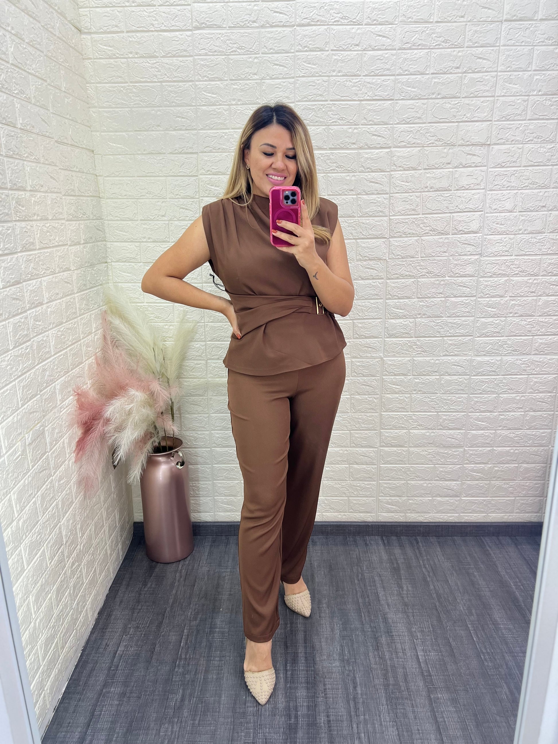 Conjunto color café compuesto por blusa sin mangas con hombreras y pantalón casual a juego. Incluye cintillo con hebilla dorada que realza la cintura y aporta un toque elegante. Confeccionado en tela suave y ligera, ideal para lucir moderna y sofisticada en cualquier ocasión. Perfecto para un look equilibrado entre lo casual y lo chic.