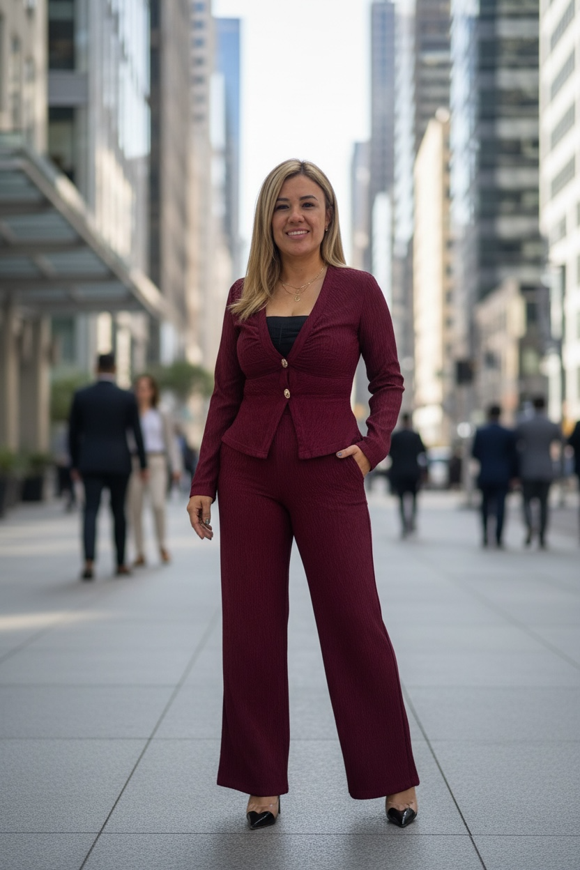 Conjunto Color Guindo Cuello V Manga Larga con Pantalón