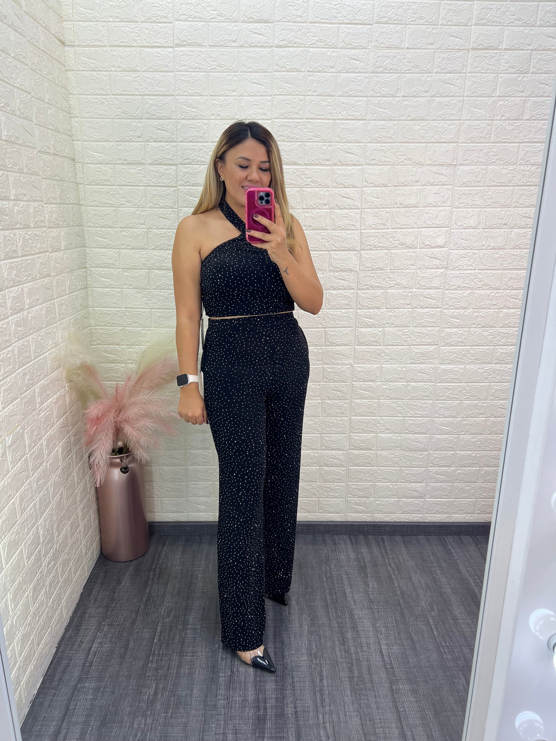 Conjunto Negro con Brillos Blusa Halter y Pantalón