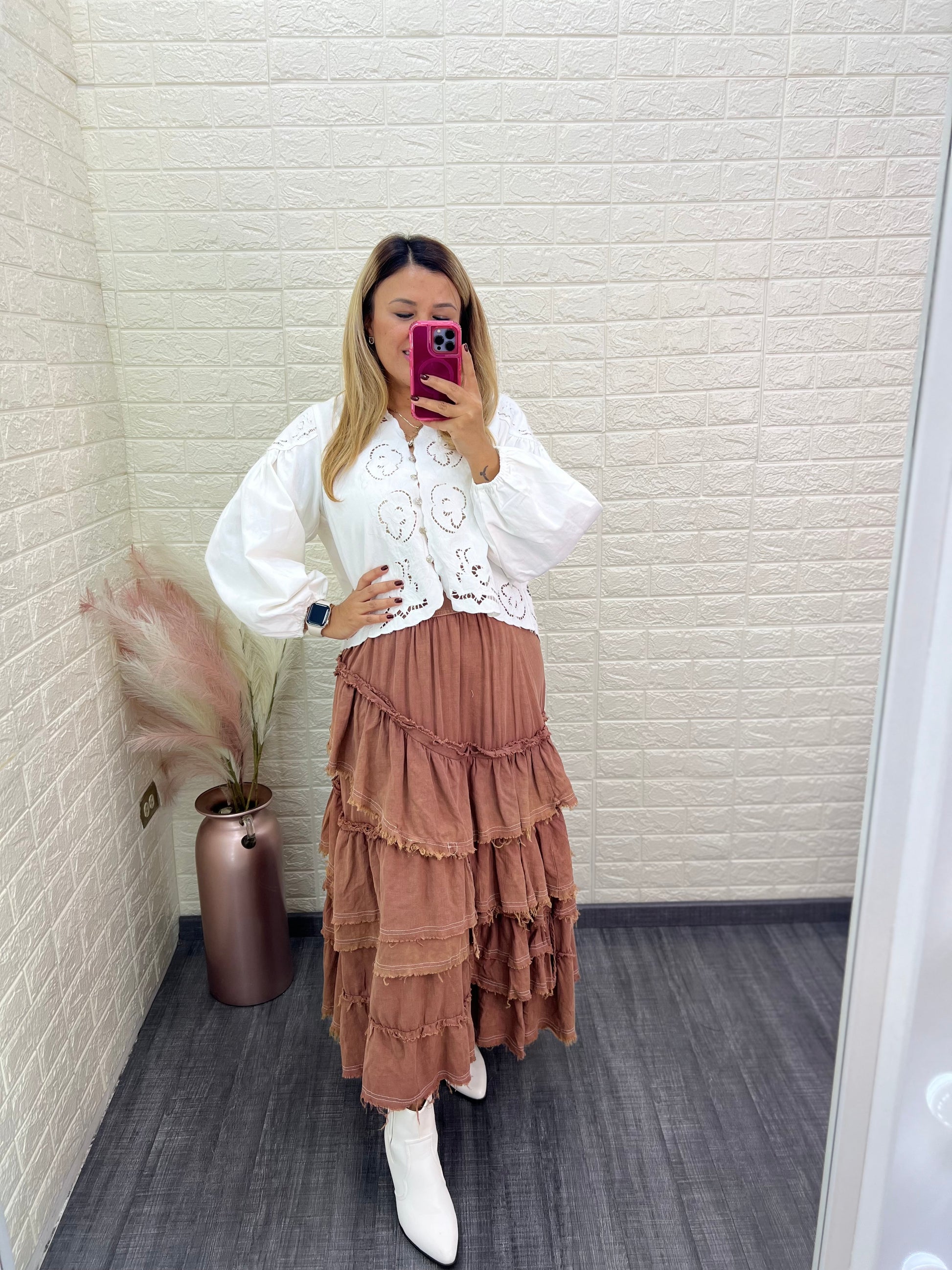 Falda larga color café claro con elegantes olanes en tiras de tela y detalles de costuras descocidas que aportan un estilo moderno y romántico al diseño. Su corte fluido y ligero ofrece comodidad y movimiento, ideal para lucir un look femenino y sofisticado. Perfecta para combinar con blusas, tops o suéteres, esta falda es una prenda versátil que se adapta tanto a ocasiones casuales como a eventos especiales, creando un outfit chic y lleno de personalidad.