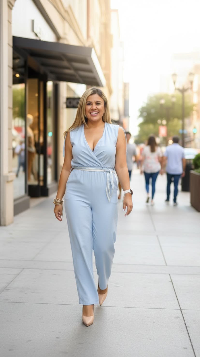 Jumpsuit Color Sky Blue en Tela de Lino con Cintillo de Pañoleta de Lunares