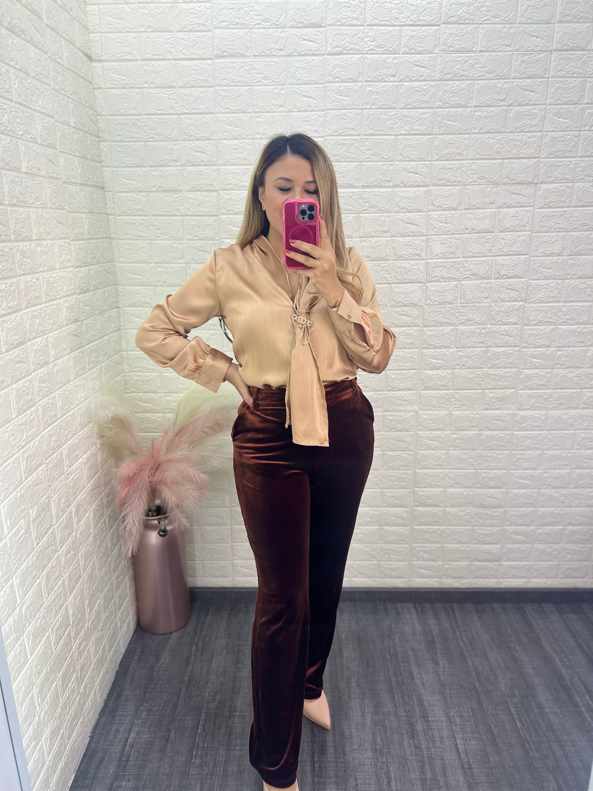 Pantalón Color Café Satinado de Velvet Corte Recto