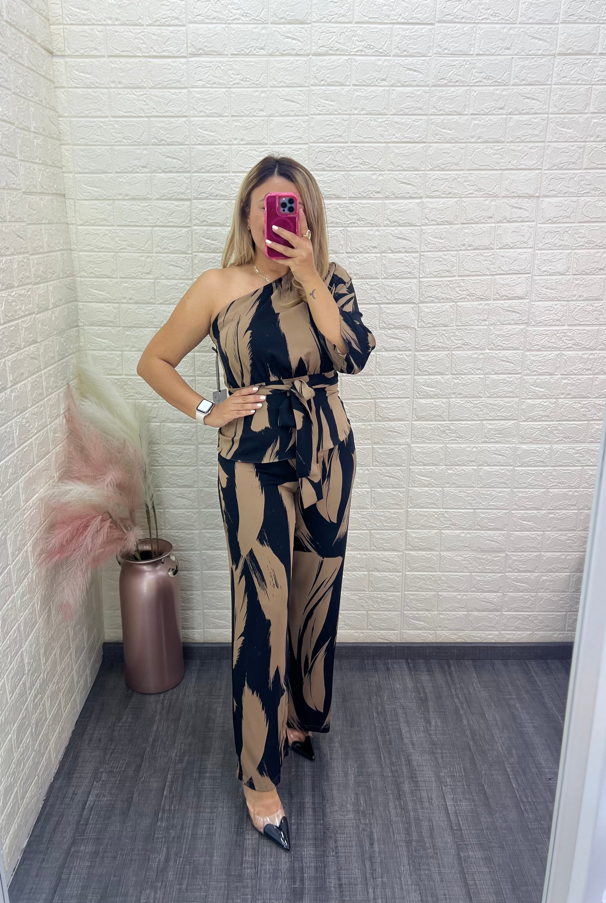 Conjunto moderno y versátil, perfecto para un look casual con estilo. La blusa color café aporta calidez y frescura, mientras que el pantalón a juego con manchas negras añade un detalle único y divertido al outfit. Ideal para el día a día, reuniones informales o salidas relajadas, se puede combinar con accesorios y calzado neutro o llamativo según tu estilo.