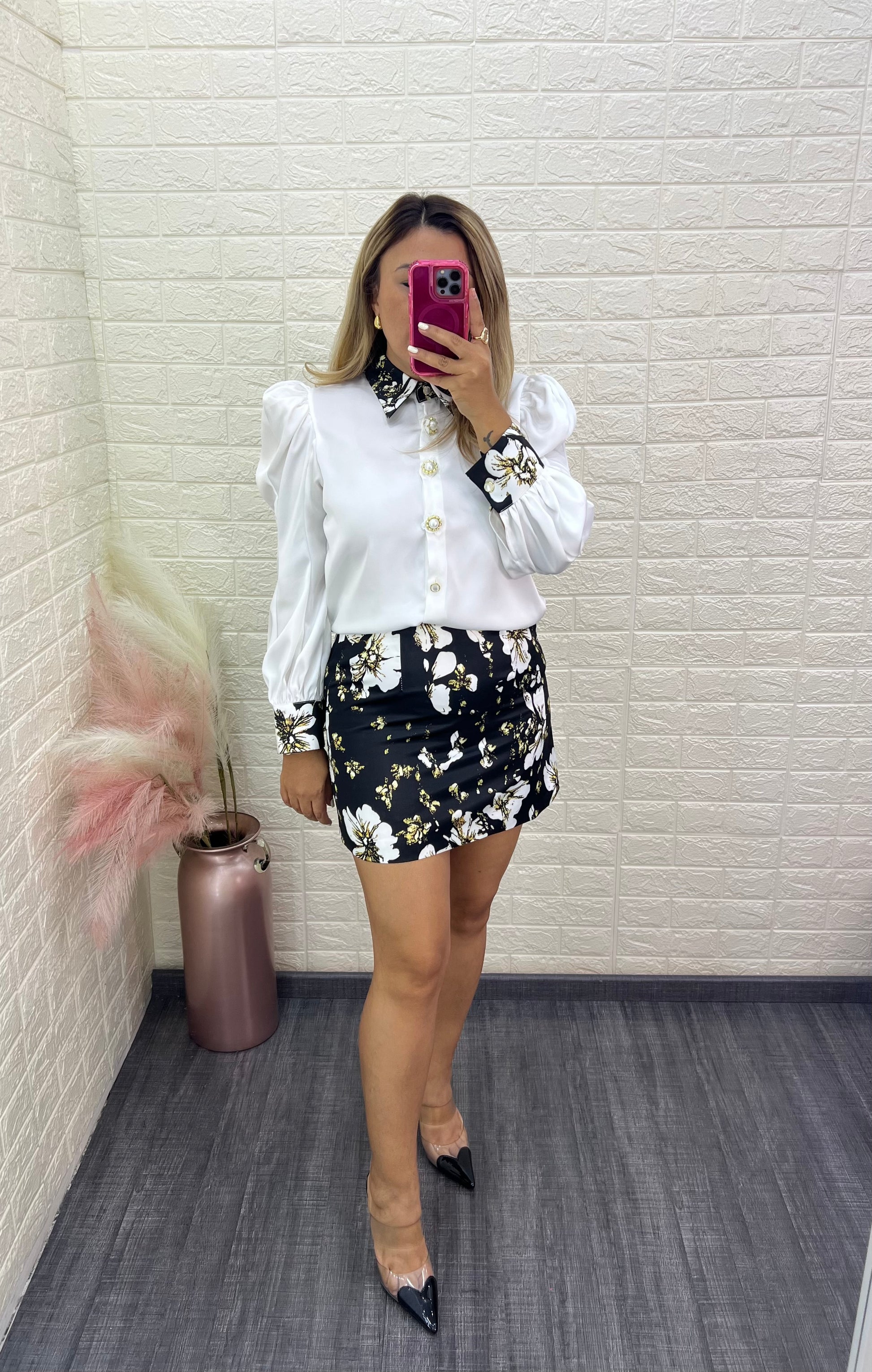 Conjunto elegante y fresco ideal para cualquier ocasión. La blusa blanca de manga larga aporta un toque clásico, mientras que la falda a juego luce un delicado estampado de flores que le da vida y estilo al outfit. Perfecto para combinar con accesorios neutros y calzado casual o formal, creando un look femenino, armonioso y lleno de encanto.