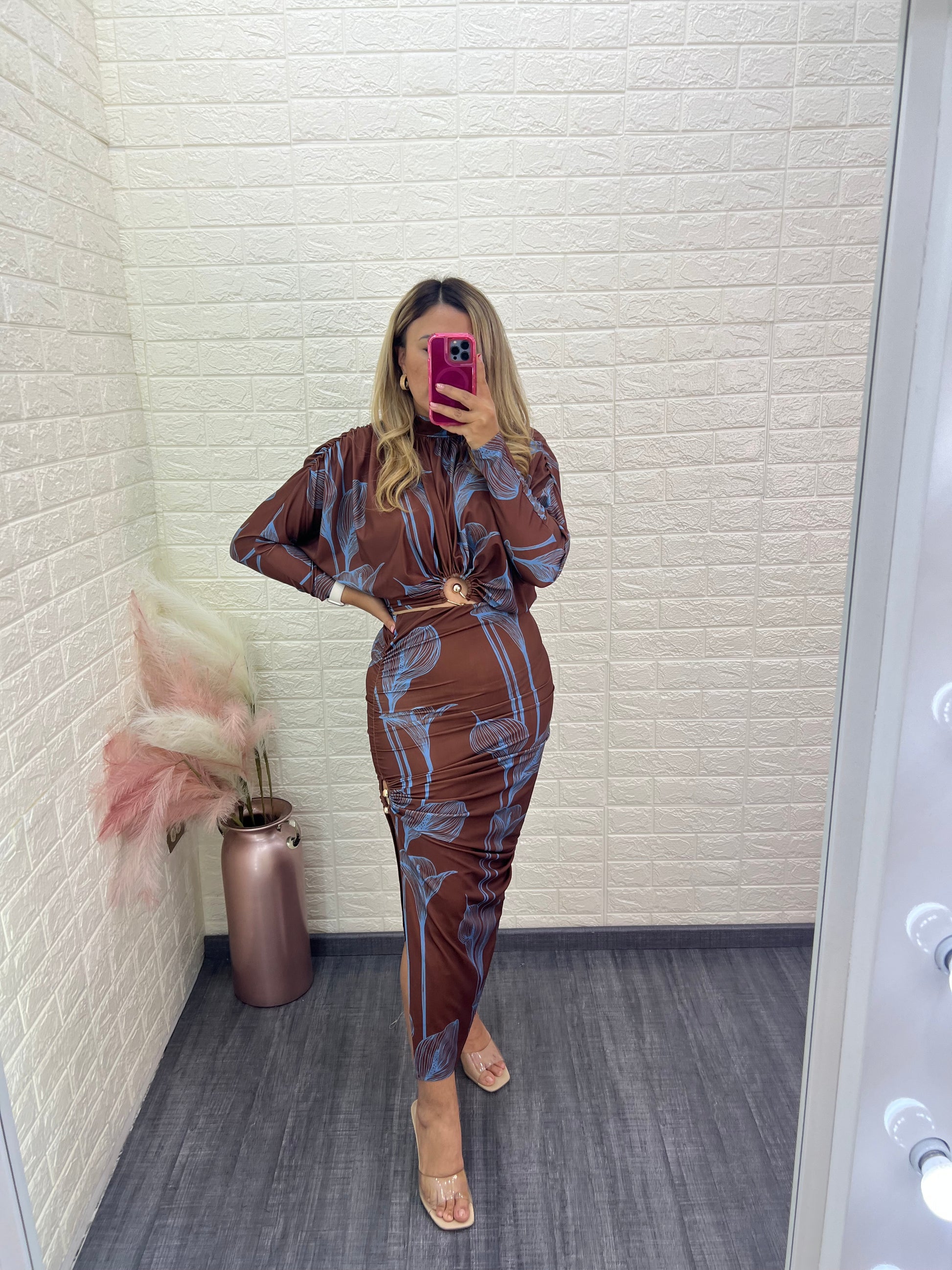 Un conjunto femenino y elegante en tonos café y azul que incluye una blusa y una falda ceñida al cuerpo, resaltando la silueta con estilo. Perfecto para ocasiones casuales o eventos donde quieras lucir un look sofisticado y moderno, combinando comodidad y elegancia.