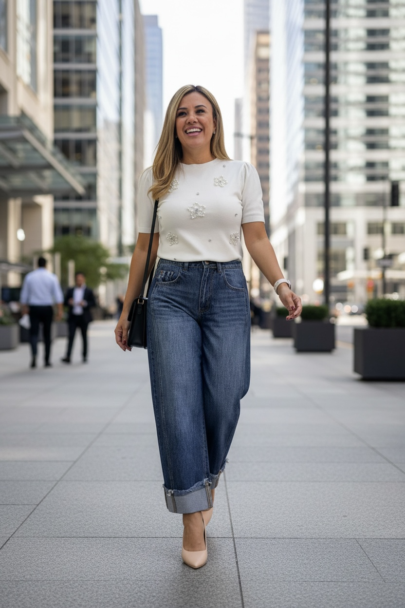 Suéter Ivory de Manga Corta Con Aplicaciones de Perlas en Flor