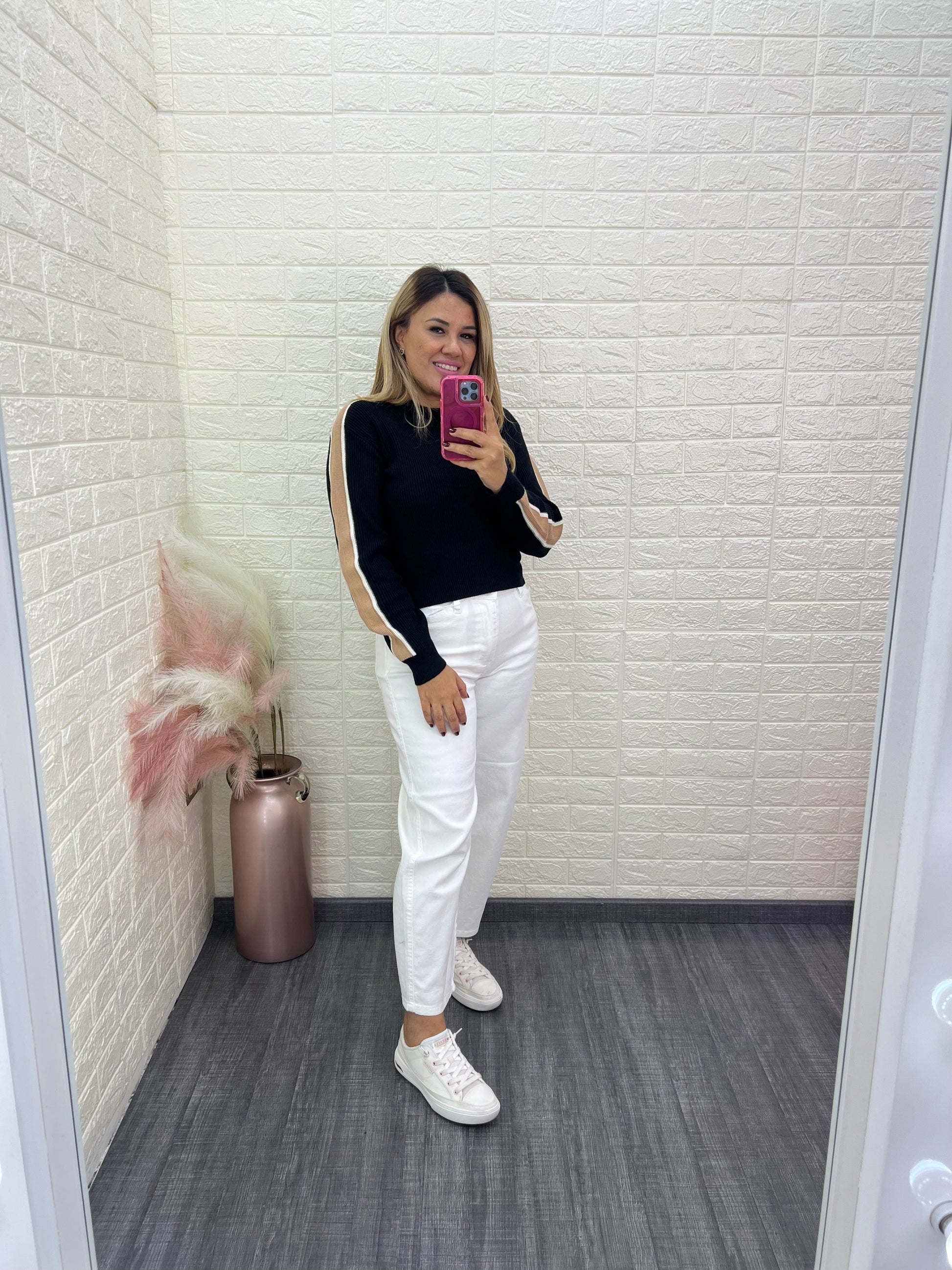 Un diseño clásico y versátil que aporta estilo y comodidad a tu look diario. Este suéter negro tejido se distingue por la línea beige en las mangas, agregando un detalle sutil y moderno. Confeccionado en tela suave y cálida, es ideal para combinar con jeans, pantalones casuales o faldas, perfecto para el día a día o salidas casuales.