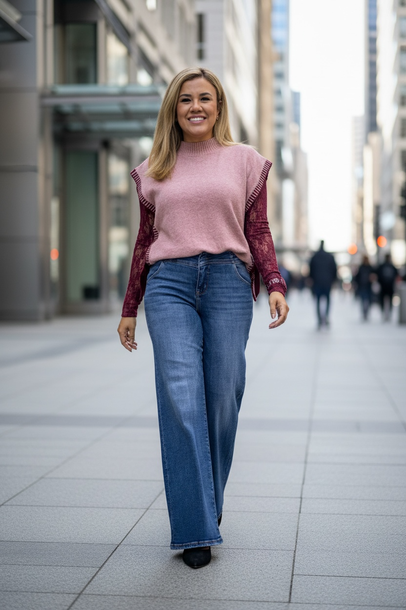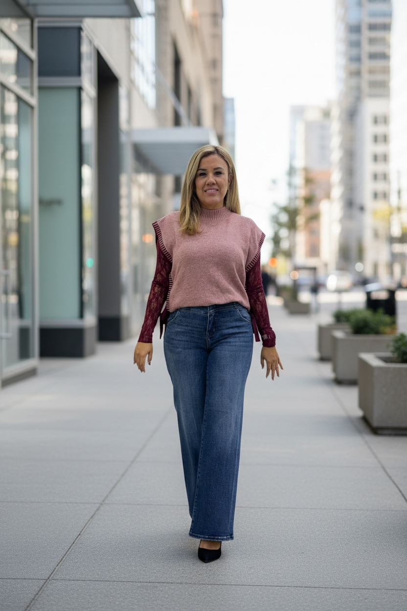 Suéter en tono rosa, sin mangas y de corte tipo capa, diseñado con jaretas a los lados que aportan un detalle elegante y moderno. Perfecto para combinar con pantalones o faldas, creando un look sofisticado y cómodo para cualquier ocasión casual o semiformal