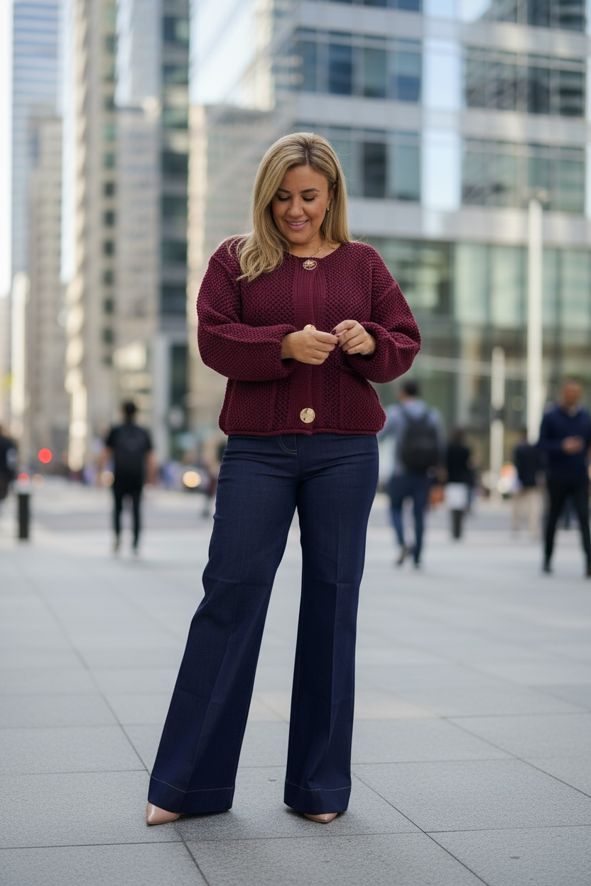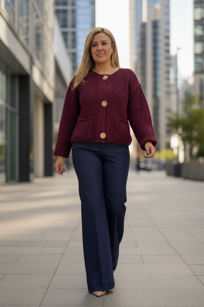 Un diseño elegante y sofisticado que combina la comodidad de un suéter con la formalidad de un blazer. Este blazer tejido en tono guindo translúcido se realza con botones dorados que aportan un toque distintivo y chic. Confeccionado en tela ligera y suave, es perfecto para la oficina, reuniones o salidas casuales. Combínalo con pantalones, faldas o jeans para un look versátil y moderno.