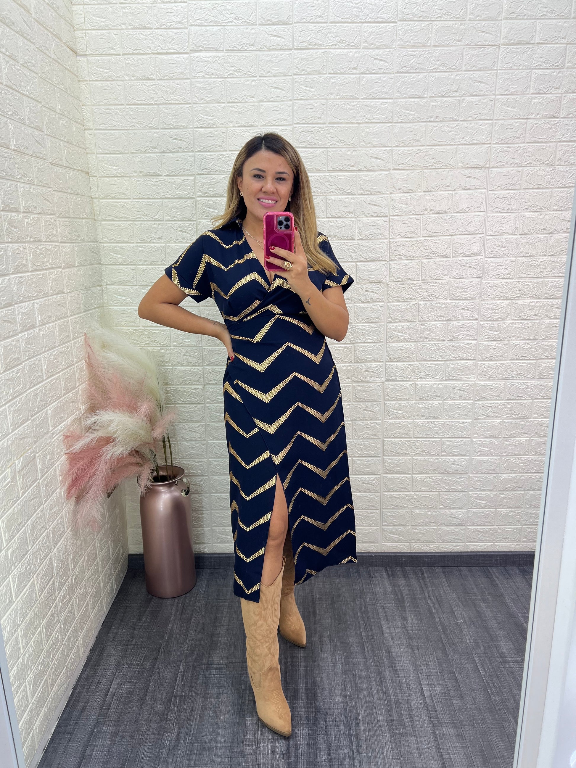 Vestido largo de diseño cruzado en elegante color azul marino, con cinto que define la cintura y delicado estampado en dorado que aporta un toque sofisticado. Ideal para eventos especiales o salidas donde quieras lucir un look elegante y femenino.